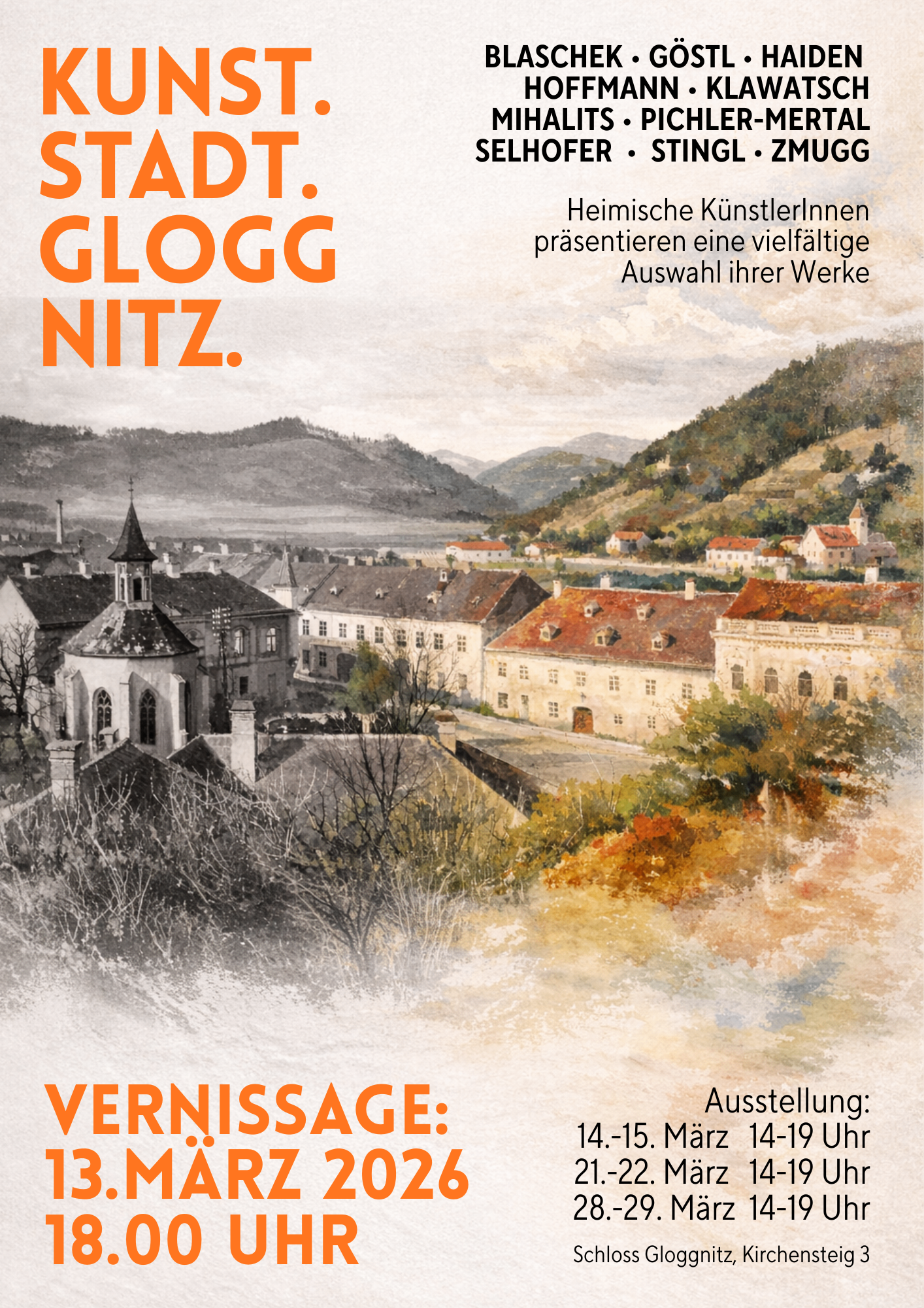 Wir beginnen das Jubiläumsjahr mit einer großen Kunstausstellung im Schloss Gloggnitz. Zahlreiche heimische Künstlerinnen und Künstler präsentieren ihre Werke im historischen Ambiente.