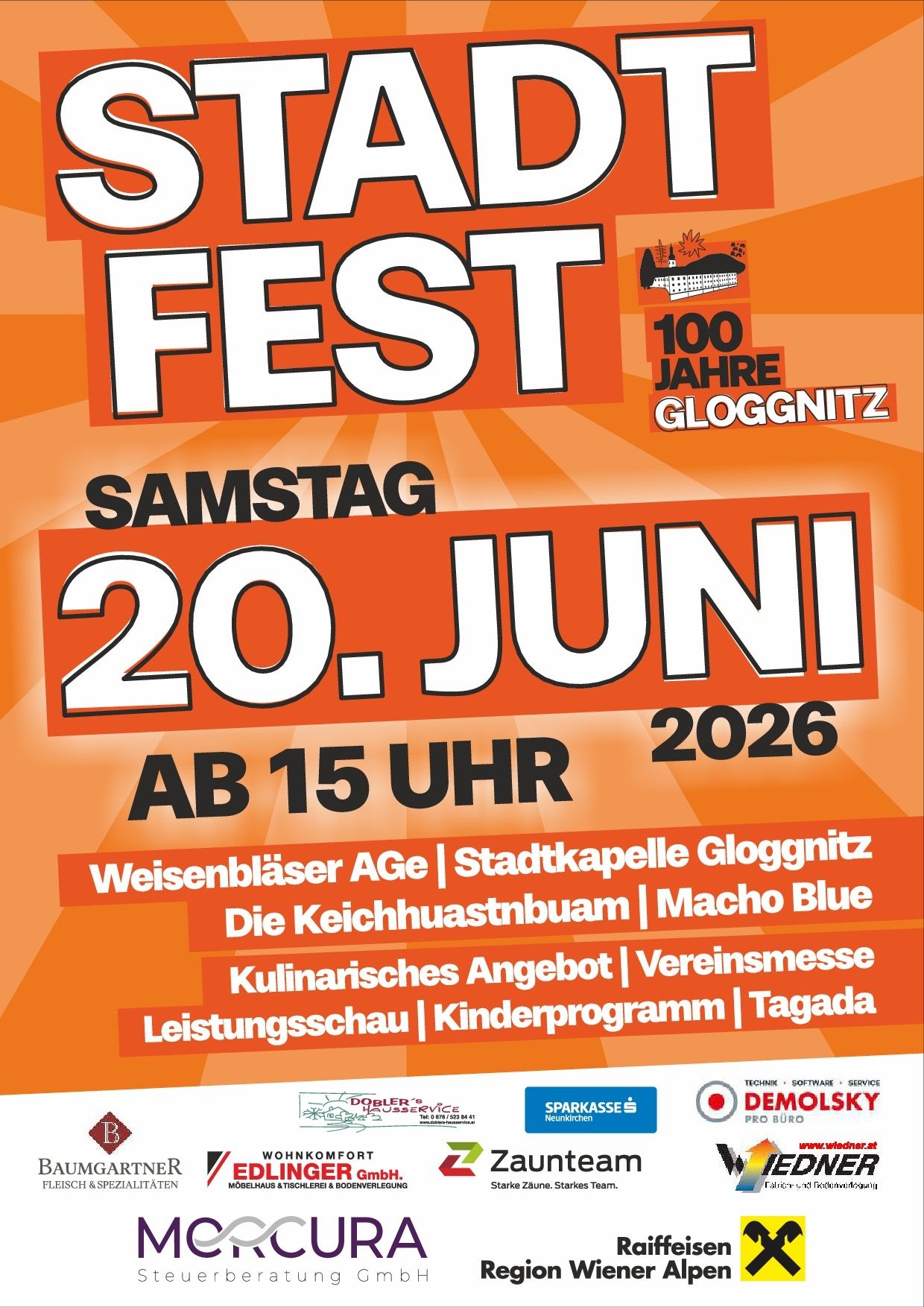Mit der Stadterhebung im Jahr 1926 begann für Gloggnitz eine neue Epoche. Aus einer traditionsreichen Marktgemeinde entwickelte sich Schritt für Schritt eine moderne Stadt mit starkem kulturellem Leben, engagierten Vereinen, florierender Wirtschaft und hoher Lebensqualität. Dieses Jubiläum ist Anlass, stolz zurückzublicken – und gleichzeitig gemeinsam in die Zukunft zu feiern.